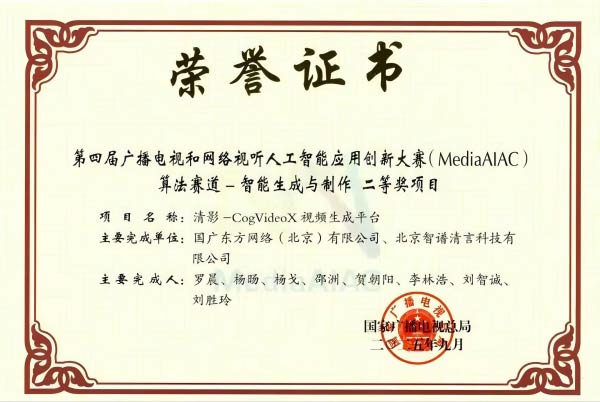 2025年9月,国广东方网络(北京)有限公司作为主要完成单位,凭借“清影-CogVideoX视频生成平台”项目在国家广播电视总局主办的第四届广播电视和网络视听人工智能应用创新大赛中,荣获算法赛道-智能生成与制作二等奖。