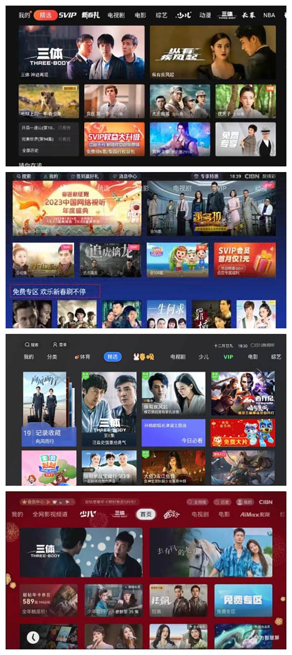 春节期间,CIBN互联网电视多个内容播出平台,开通春节免费看专区,为广大OTT用户奉上电视剧、电影、综艺、纪录片、动画等多种类型的优质内容,满足用户多样化观看需要。用户锁定CIBN高清影视、CIBN酷喵影视、CIBN极光、CIBN微视听、CIBN聚精彩、PPTV、乐视电视、华为智慧屏、酷开电视、夏普电视首屏首页进入“免费专区”,“兔年视觉盛宴”即刻呈现。