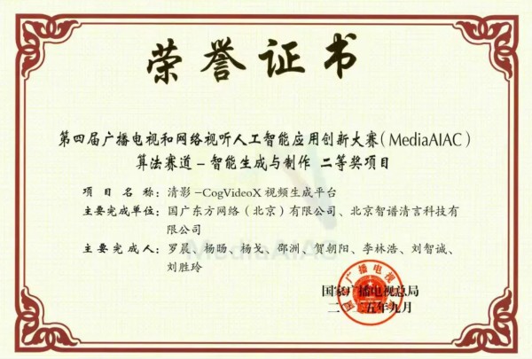 同月,国广东方与北京智谱清言科技有限公司联合打造的“清影-CogVideoX视频生成平台”,在第四届广播电视和网络视听人工智能应用创新大赛中斩获算法赛道-智能生成与制作二等奖。据了解,该平台采用先进的3D因果VAE与专家Transformer人工智能技术,能够有效提升模型对不同场景的适应性和泛化能力,为高质量视频生成提供强力支撑。目前,该平台已广泛应用于影视制作、广告创意等多个领域,在降低制作成本、缩短创作周期、推动内容生产的智能化升级等方面发挥着重要作用。